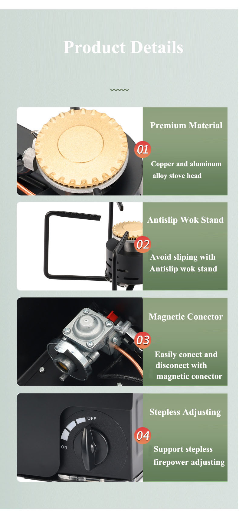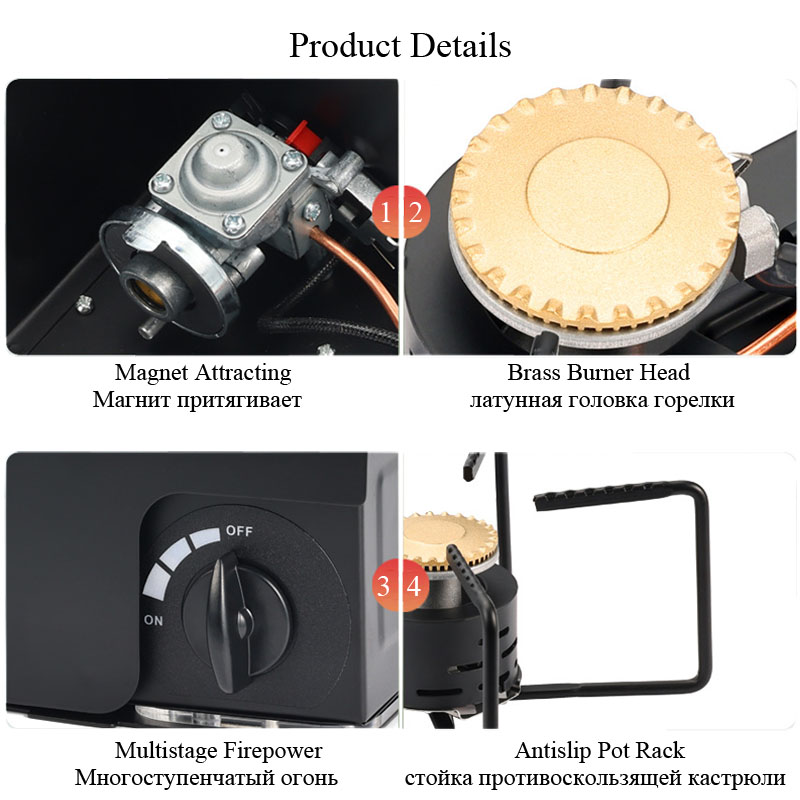 Safety Use- The butane stove has an electronic ignition switch and adjustable knob for firepower adjustment, Anti-leakage design ensure safe use, the switch is not closed, the butane gas tank can not be installed. The magnetic over pressure protection valve is adopted. When the pressure of the butane fuel canister is too high, the canister will automatically fall off and cut off the gas supply.